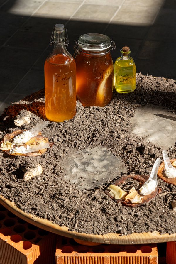 A round brick table is a complex system of symbols exploring motherhood, colonialism and rootedness. The composition of soil, prints done by a sustainable darkroom process with ginger and ginger flowers from Hong Kong, edible paper spoons and ginger ferments and dishes such as ginger kombucha candied ginger, ginger pickles, ginger fried rice, offers the artist multiple entry points to investigate one's identity as from honouring her mother's postpartum meals to Hong Kong's symbols of resistance, the work weaves personal history with political landscapes, inviting participants to dig, eat and ferment identity politics.